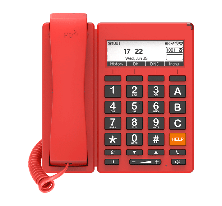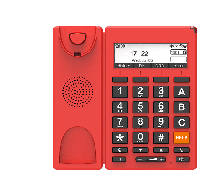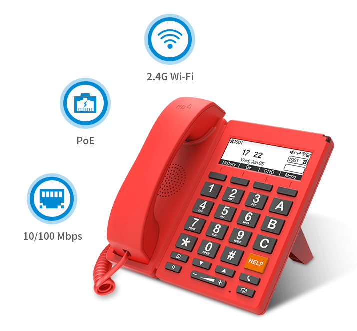 FIP12WP-R é um telefone IP dual-line projetado para ajuda emergencial, com aparência vermelha e botões grandes, ideal para telefone de incêndio, hospitais e locais públicos. Suporta Ethernet PoE e também Wi-Fi 2.4GHz, facilitando e acelerando a conexão à rede. Possui 4 botões DSS para A/B/C e HELP, permitindo chamadas com uma única tecla. Conta com montagem em parede, facilitando o acesso e liberando espaço importante para outras tarefas.