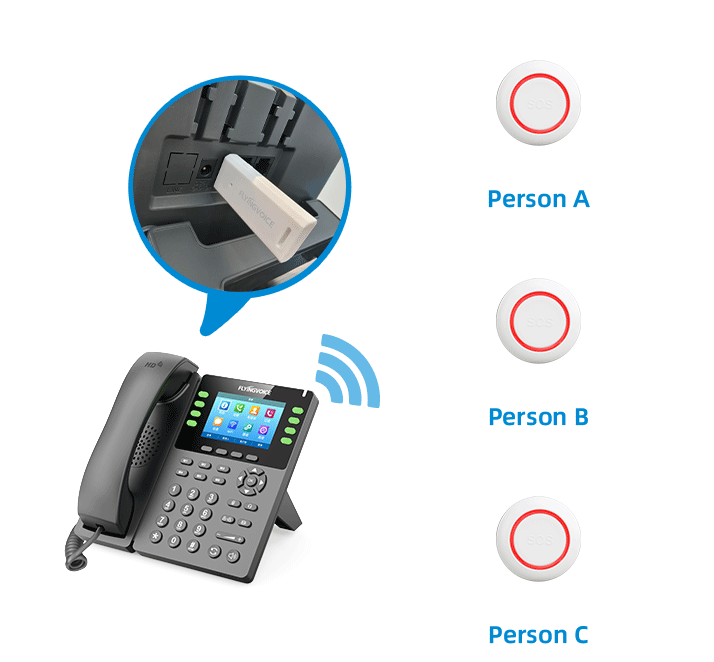 O Kit de Botão SOS Flyingvoice (HB01&USB433) é um botão de emergência sem fio delicado e compacto, com luz de alerta estilosa, projetado para cenários de chamadas de emergência. Com o receptor USB, o telefone IP pode ser usado para chamar o centro de atendimento, estação de enfermagem e outros locais com uma única tecla em caso de emergência.
