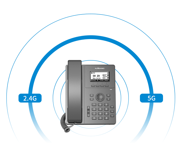 O Flyingvoice P10W é um dispositivo de comunicação de alto desempenho para usuários empresariais. Equipado com uma tela gráfica LCD de 132×64 pixels com retroiluminação ajustável, oferece uma experiência visual clara aos usuários. O P10W suporta 2 contas SIP, integra Wi-Fi dual-band 2,4 GHz e 5 GHz para fácil conexão à rede. Além disso, suporta tecnologias de voz em HD, incluindo os codecs de banda larga G.722 e Opus para chamadas de alta qualidade. Pode ser facilmente posicionado em ângulos de 45° e 60° sobre a mesa ou montado na parede em 15°, adaptando-se a diferentes cenários de aplicação.